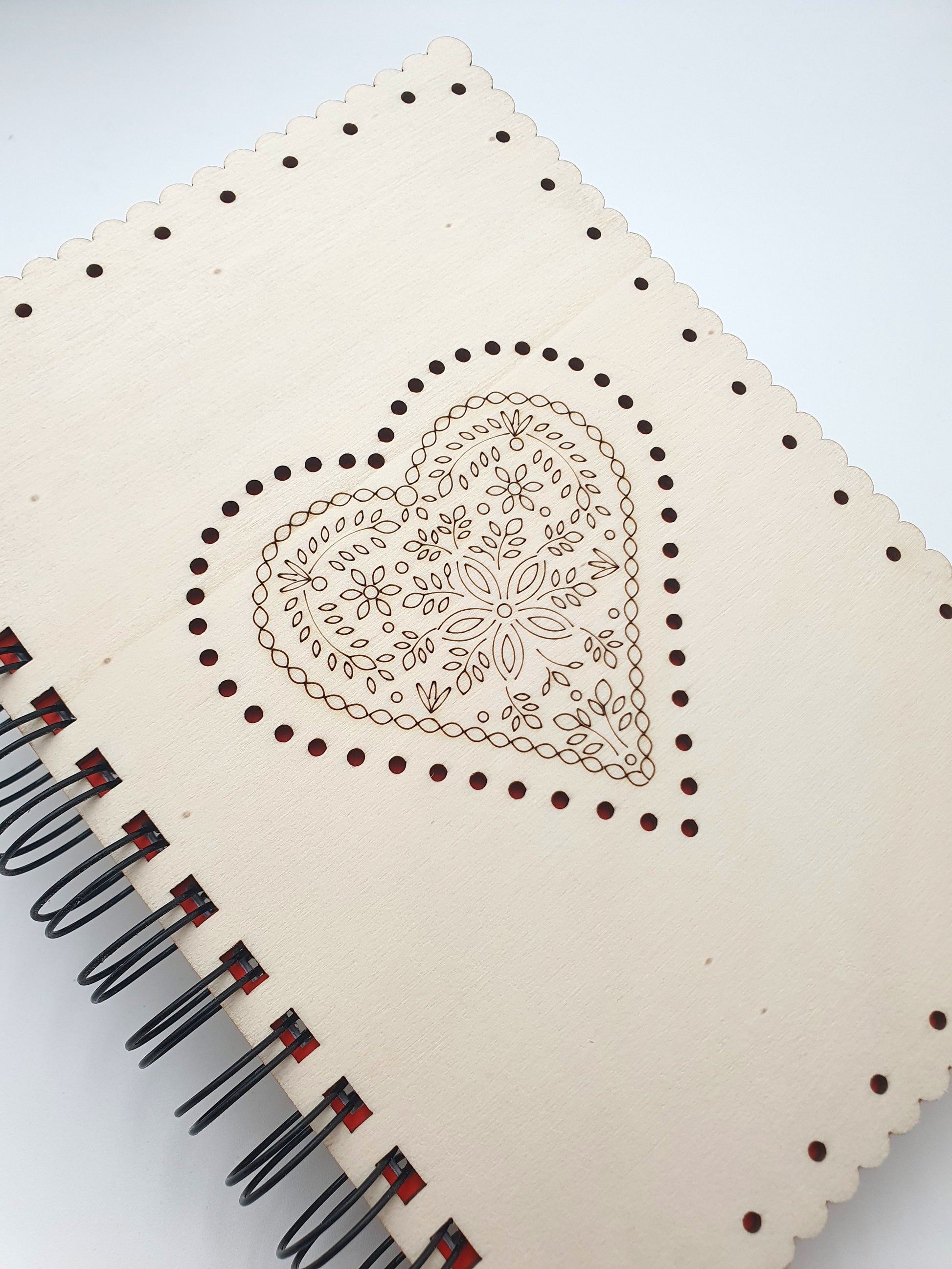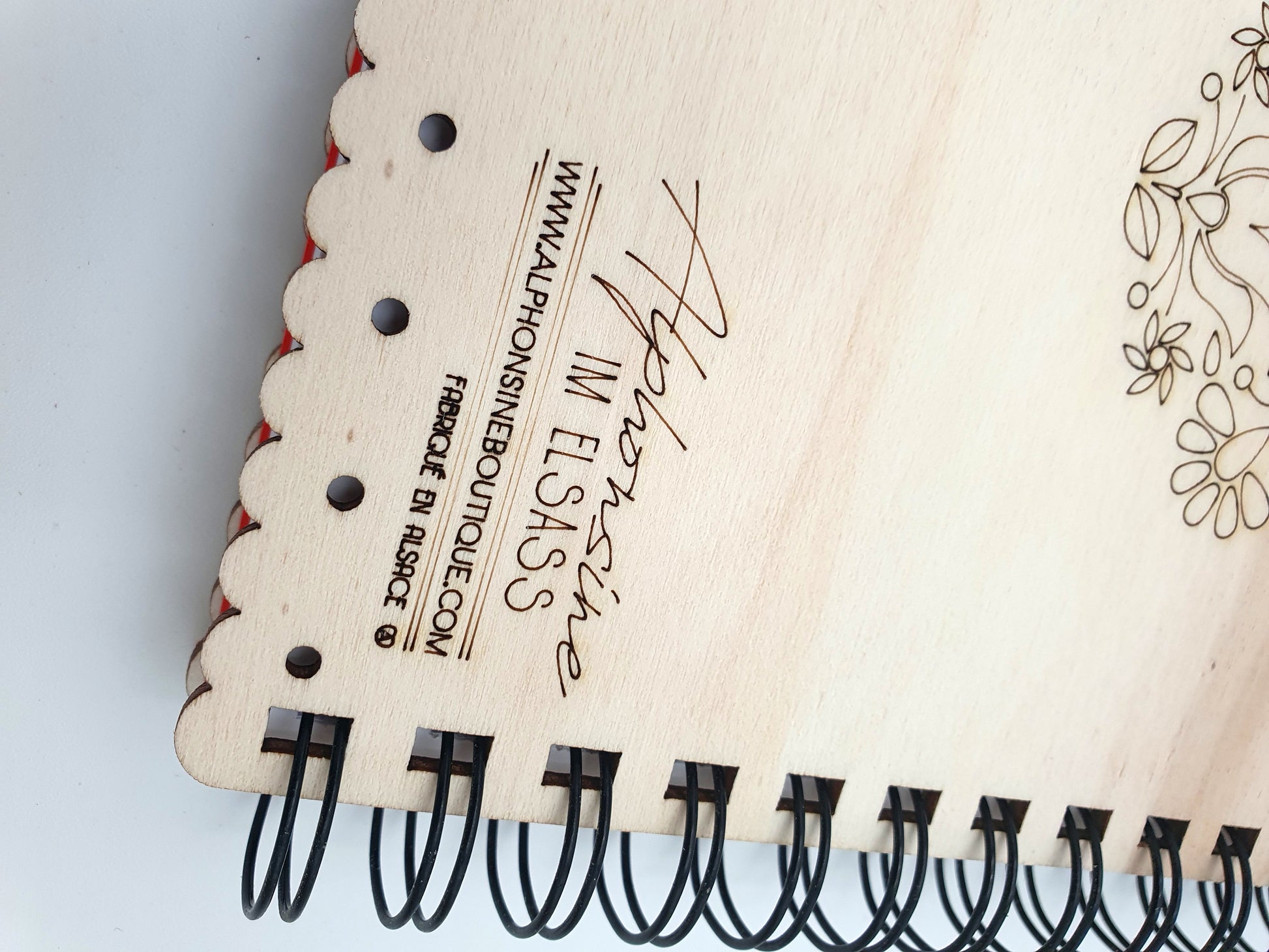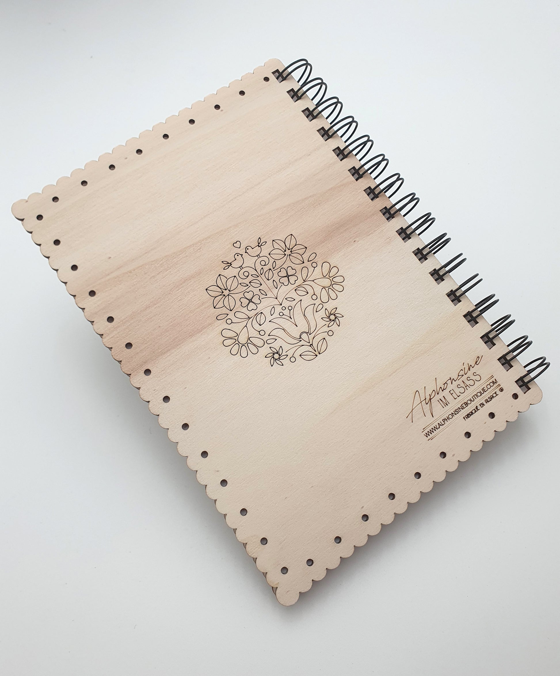 Sa couverture en bois finement gravée au laser présente un motif de cœur fleuri inspiré des traditions alsaciennes, tandis que le dos du carnet arbore un second dessin traditionnel avec des oiseaux.