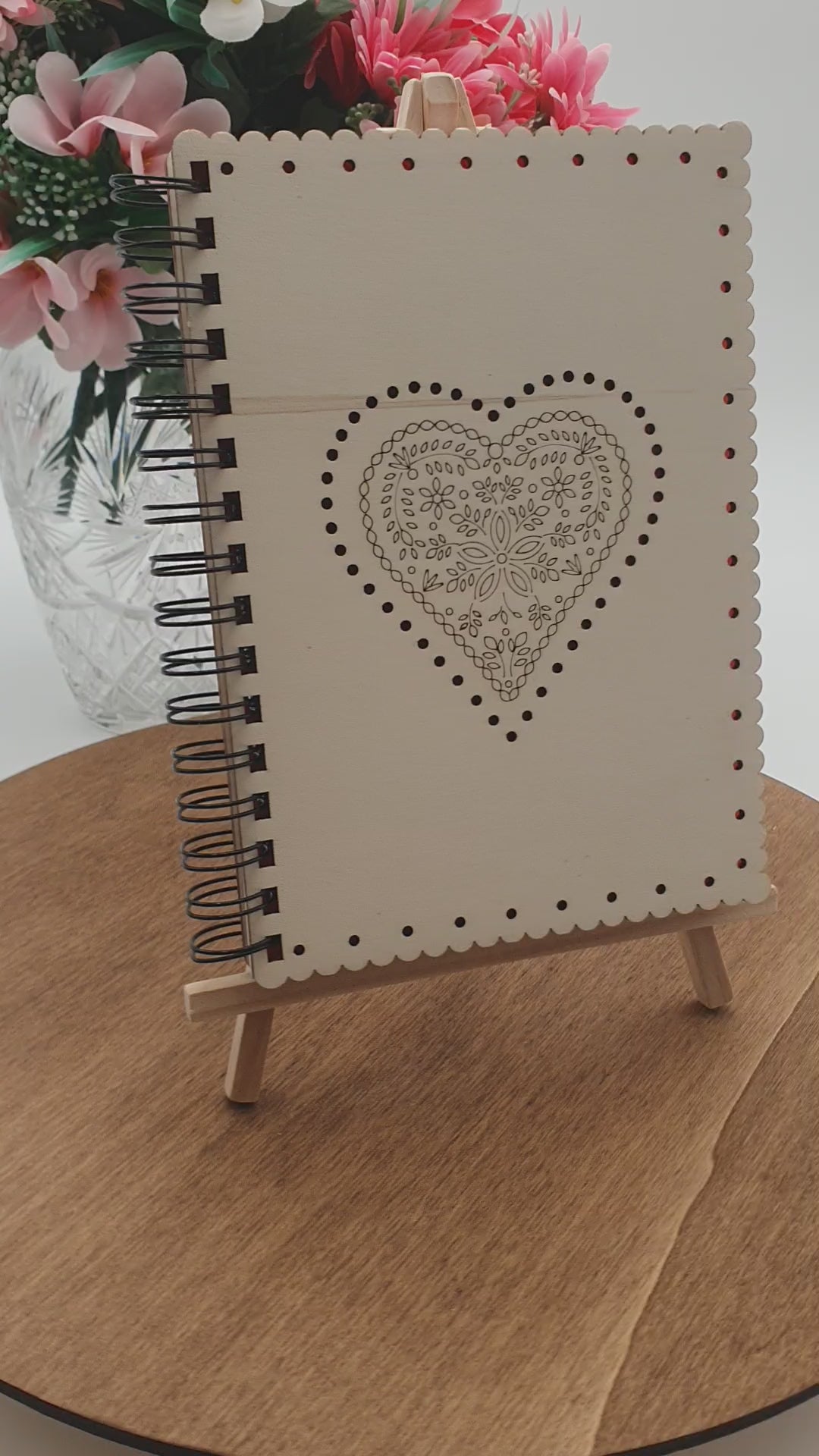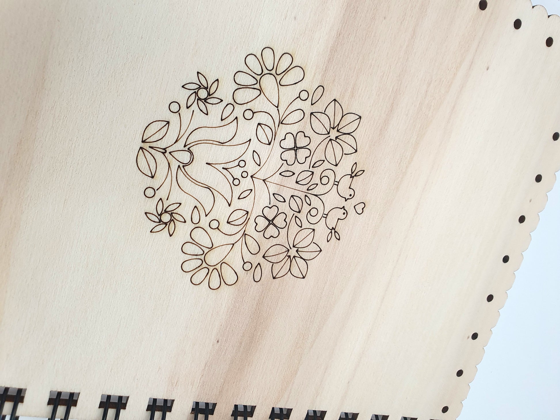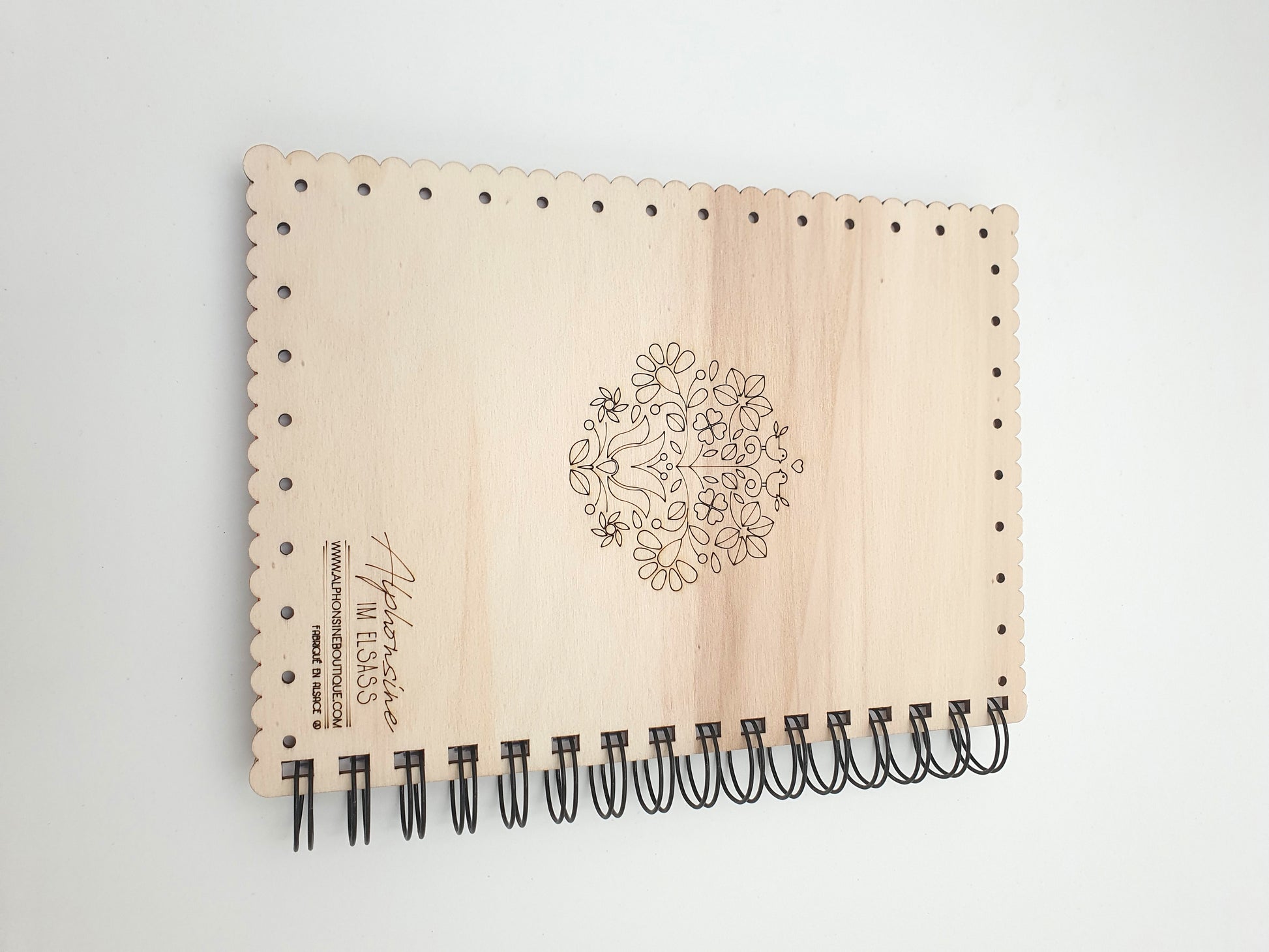 Sa couverture en bois finement gravée au laser présente un motif de cœur fleuri inspiré des traditions alsaciennes, tandis que le dos du carnet arbore un second dessin traditionnel avec des oiseaux.