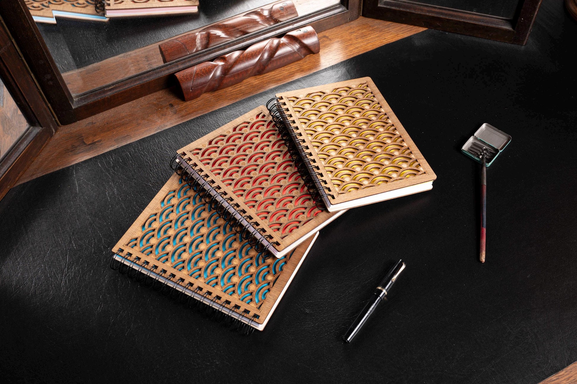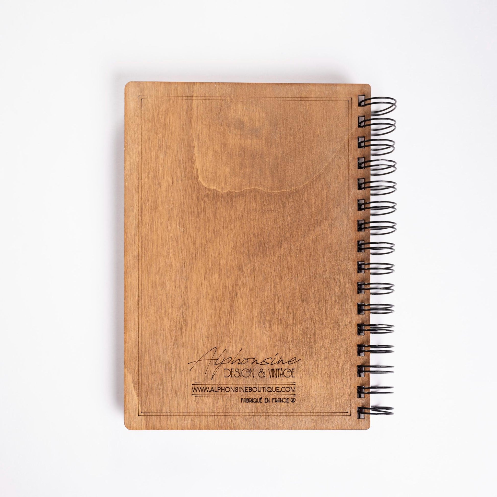 Discover this A5 dark wood notebook, decorated with a traditional Japanese "Seigaiha waves" pattern, perfect for a bullet journal, a recipe book or a wedding guest book.