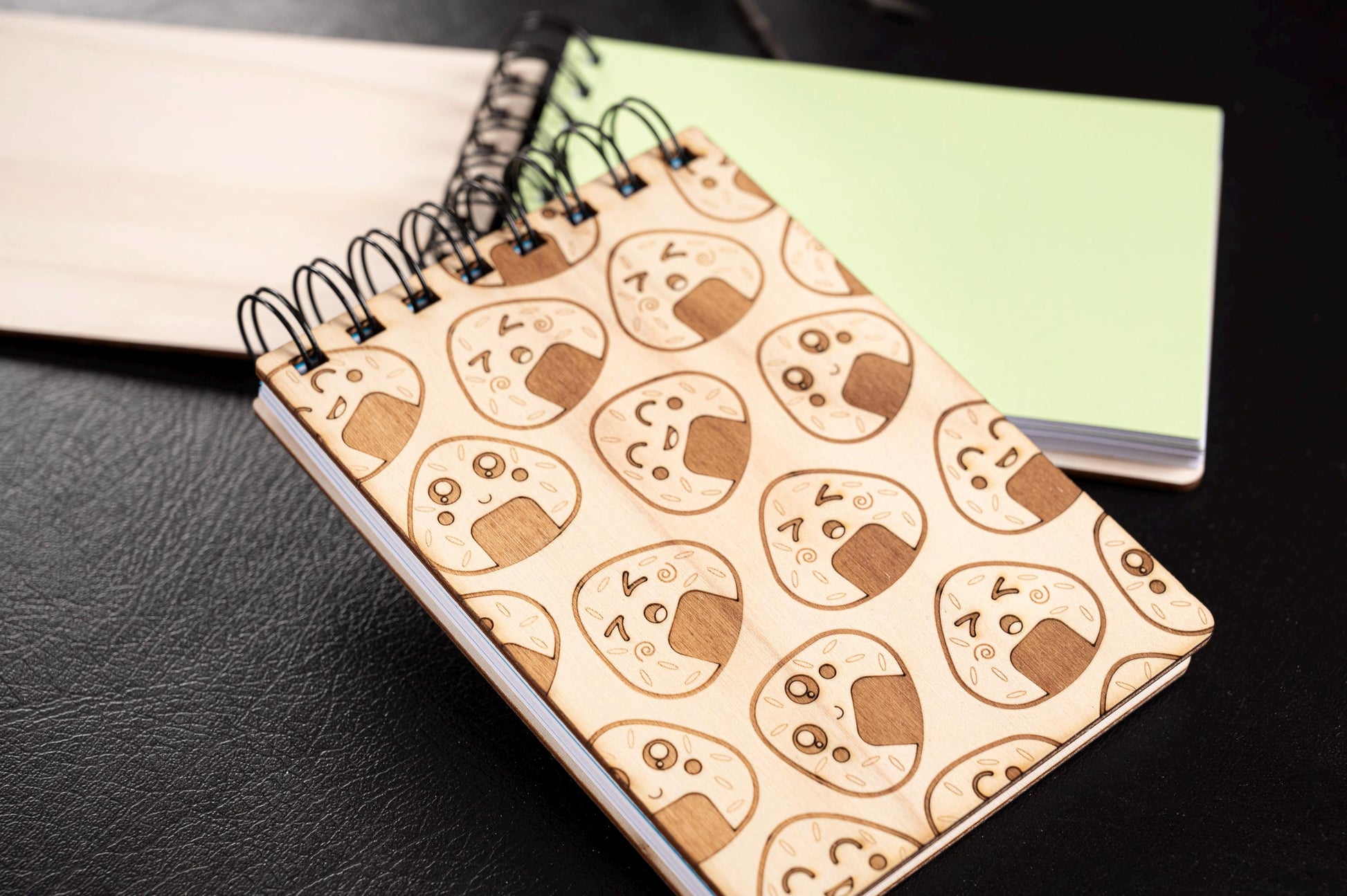 Kawaii Onigiri Engraved Wooden A6 Notebook – Diary, Recipes, Notes, Handmade Stationery Made in France