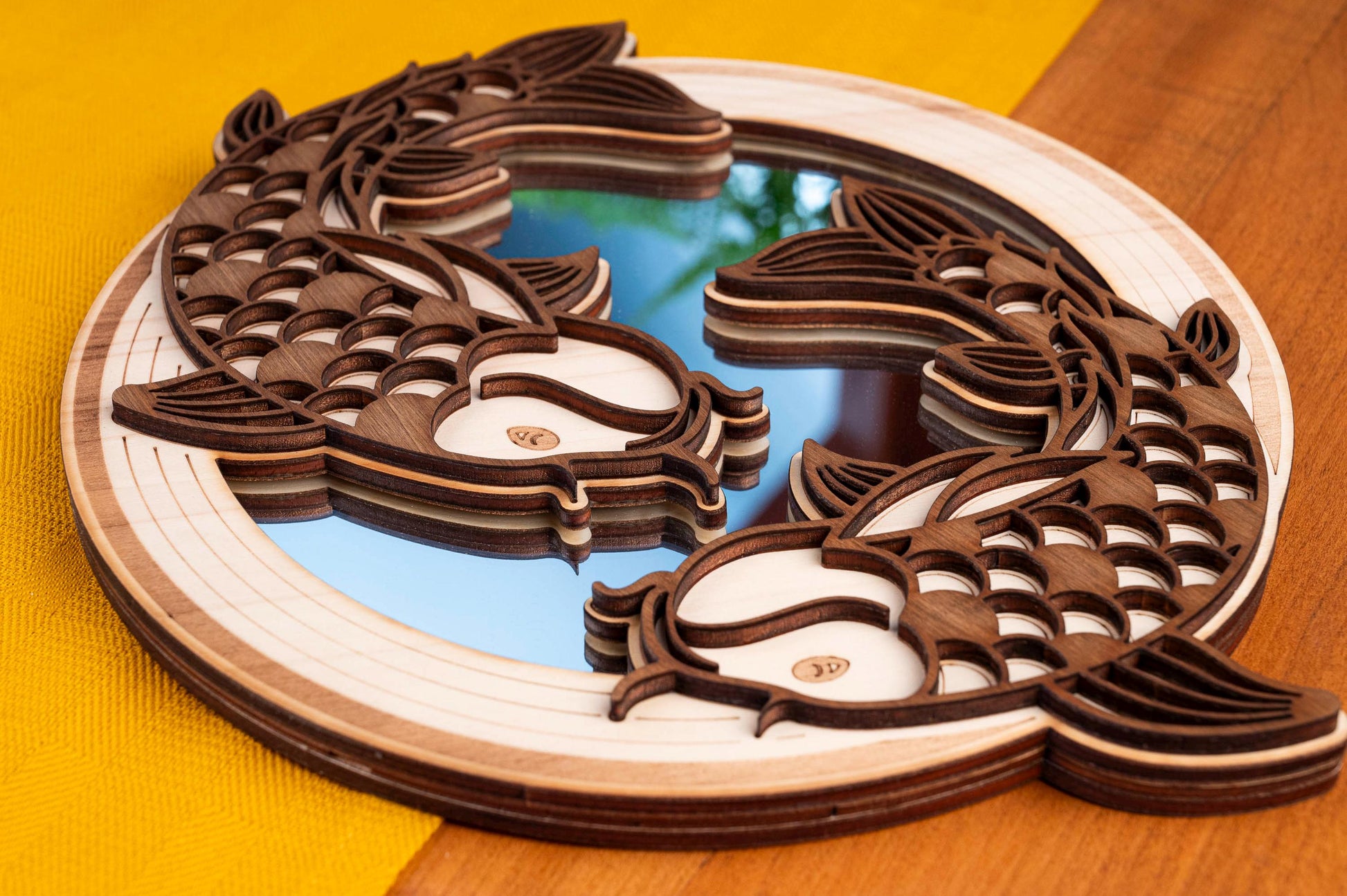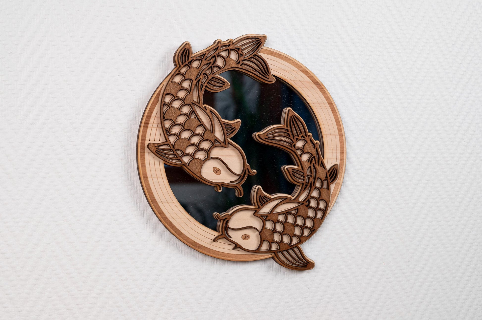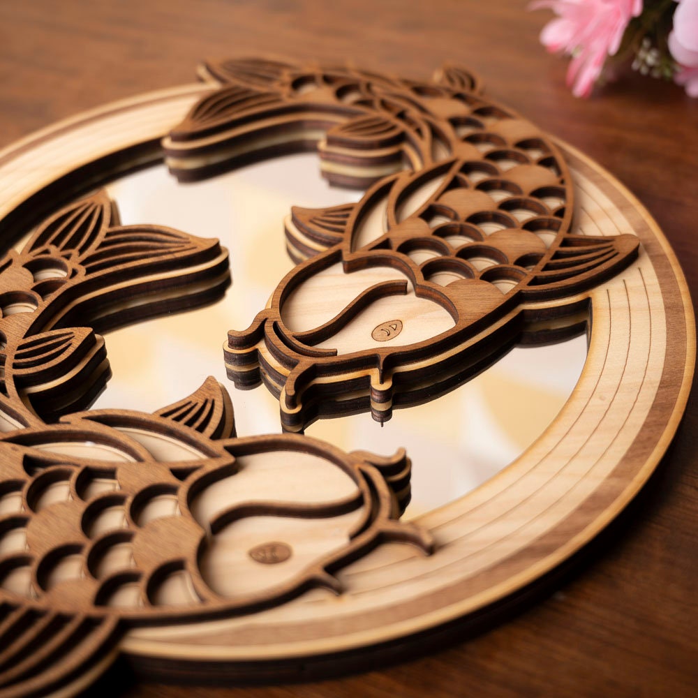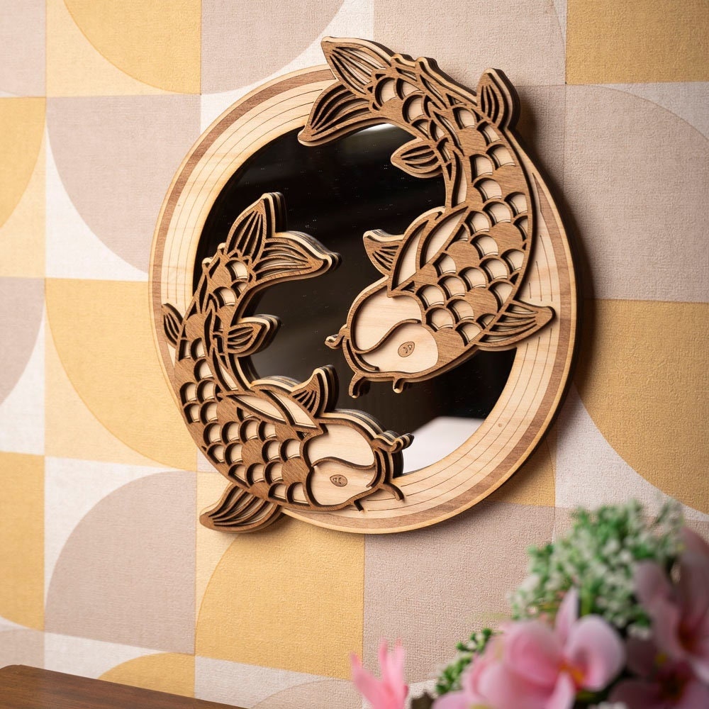 Koi Carp Mirror Wooden Wall Decoration – Traditional Japanese Zen Art – Nishikigoi Fish Handmade Asian Gift – Made in France