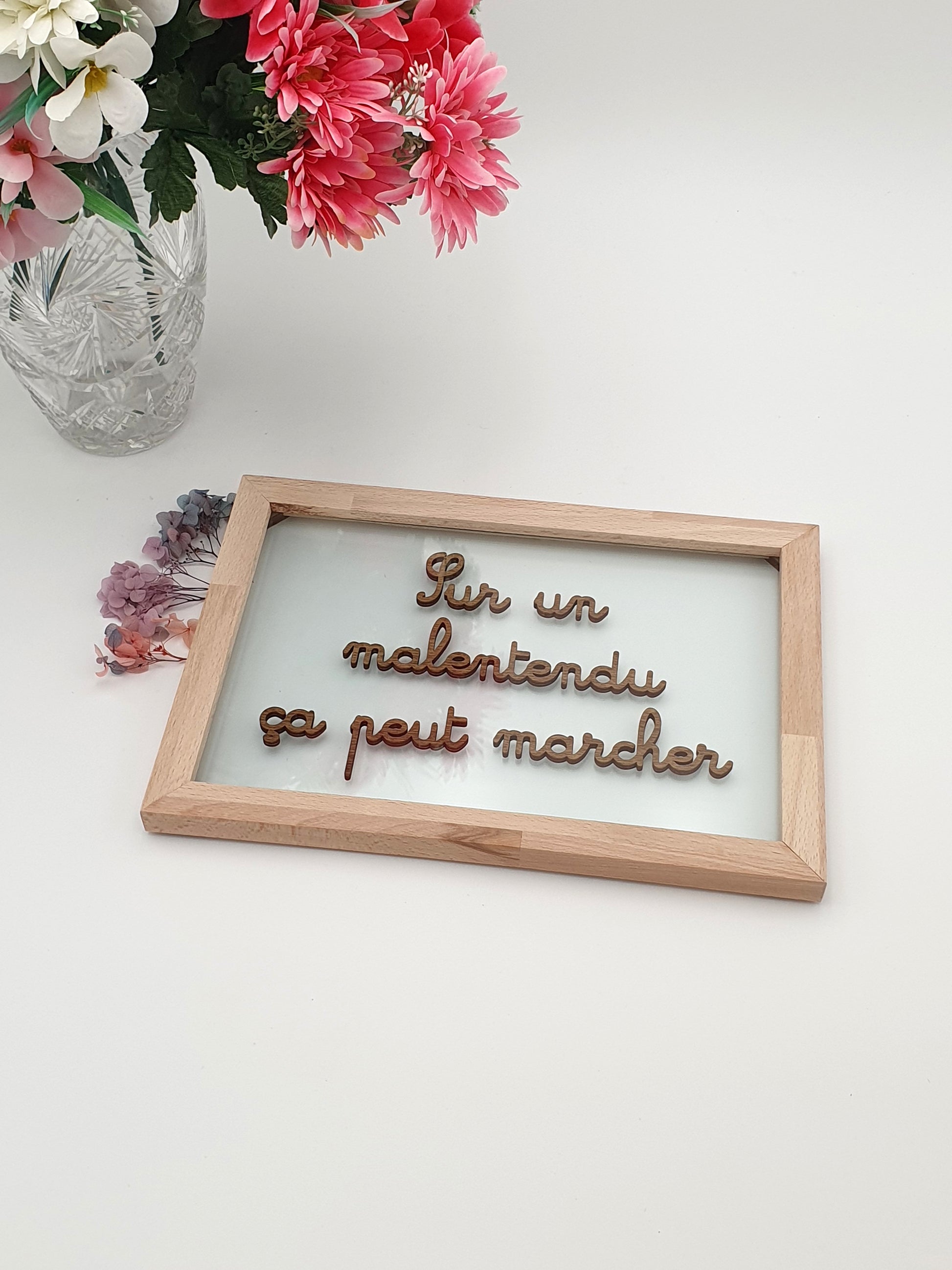 La phrase légendaire “Sur un malentendu, ça peut marcher” est découpée en bois et semble flotter dans le cadre en verre, pour un effet moderne et décalé.