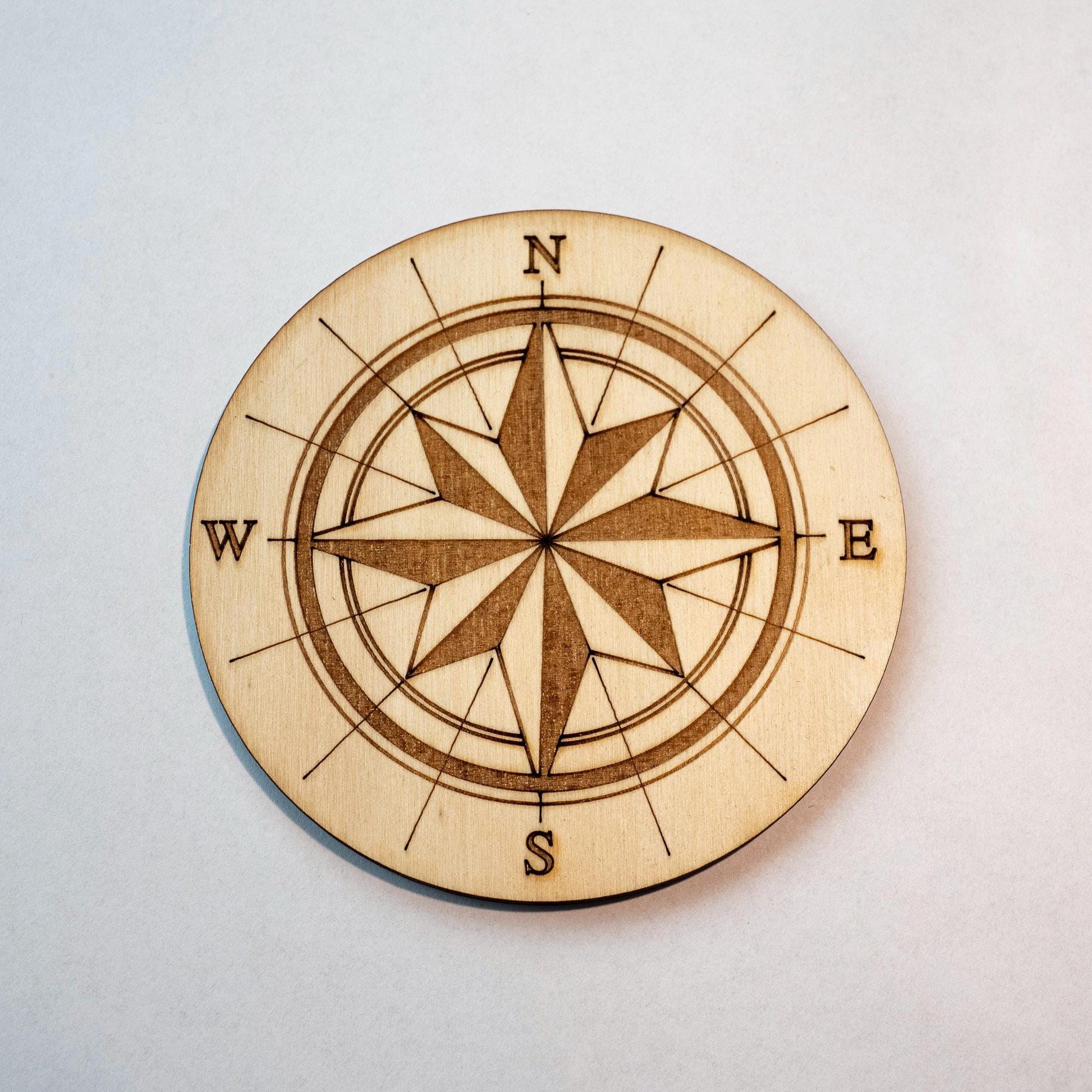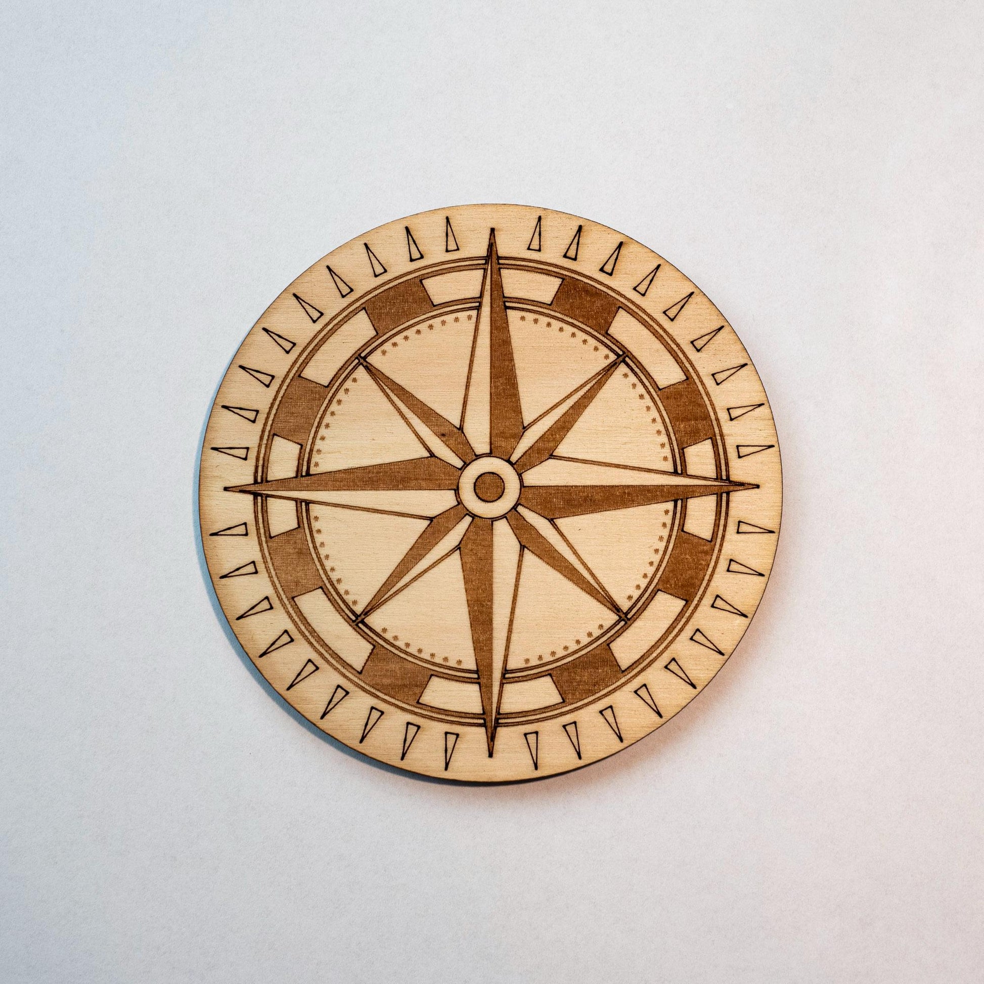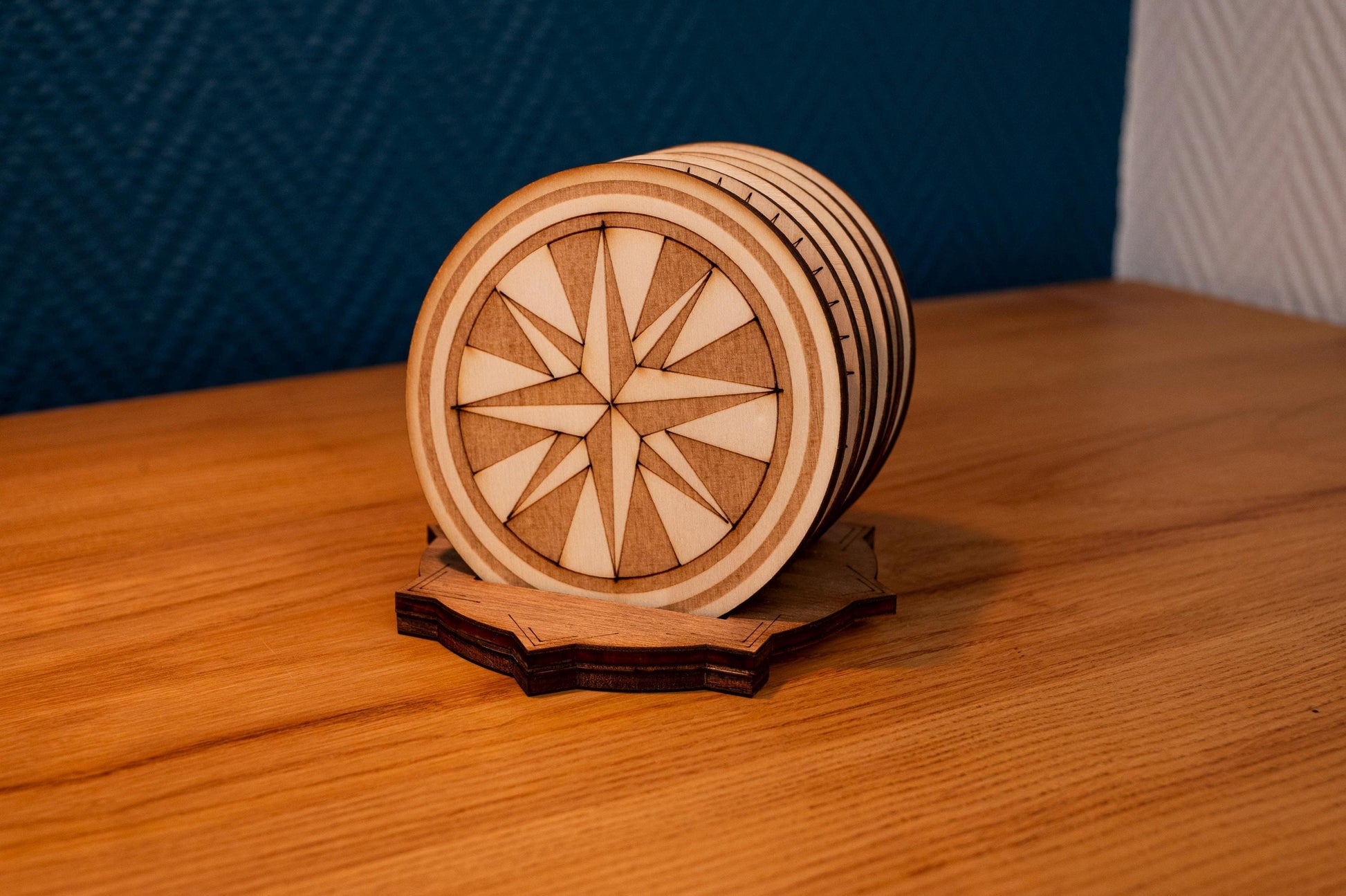 Bring a touch of retro elegance to your table with this set of 6 wooden coasters inspired by wind roses, compasses and compasses!