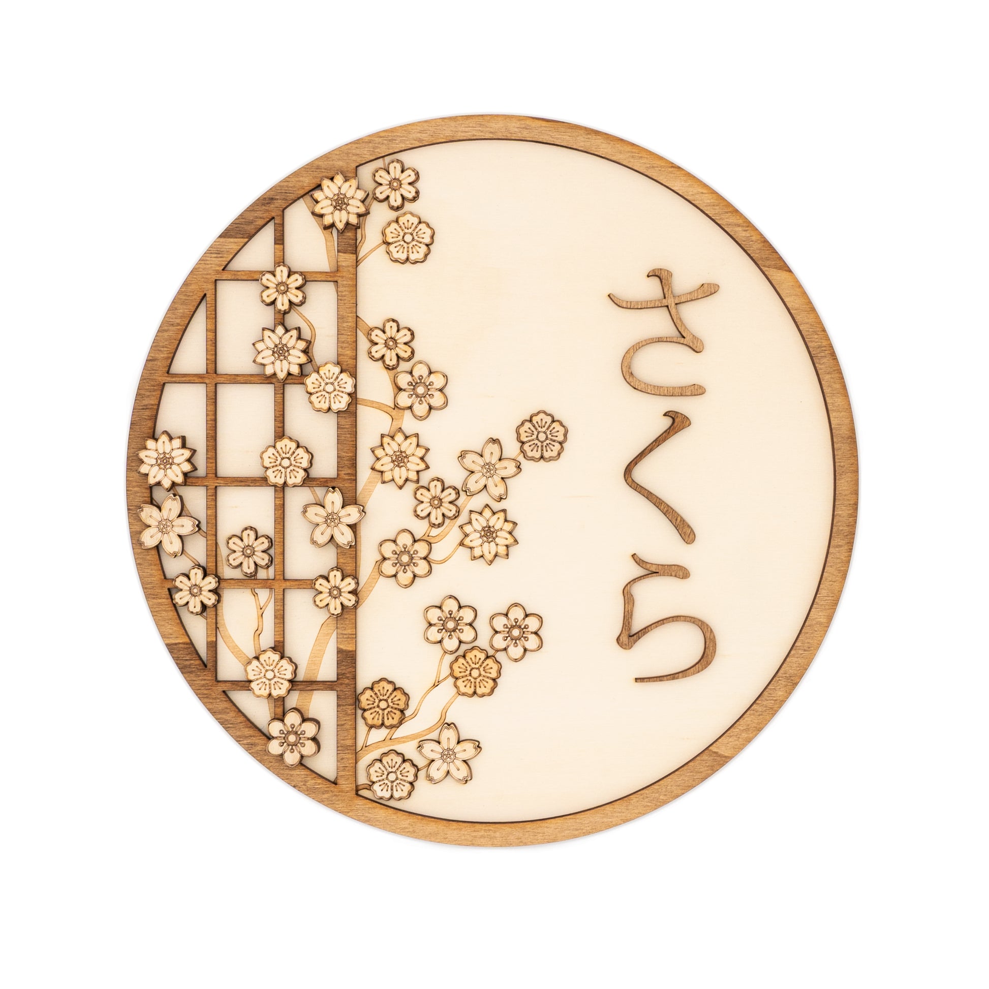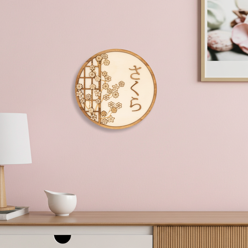Apportez une touche d’élégance japonaise à votre intérieur avec cette décoration murale en bois inspirée du Hanami, la tradition japonaise de contemplation des cerisiers en fleurs. Ce panneau rond de 30 cm représente des fleurs de sakura délicatement gravées et découpées au laser, accompagnées de la calligraphie japonaise さくら (sakura), qui signifie « fleur de cerisier ».
