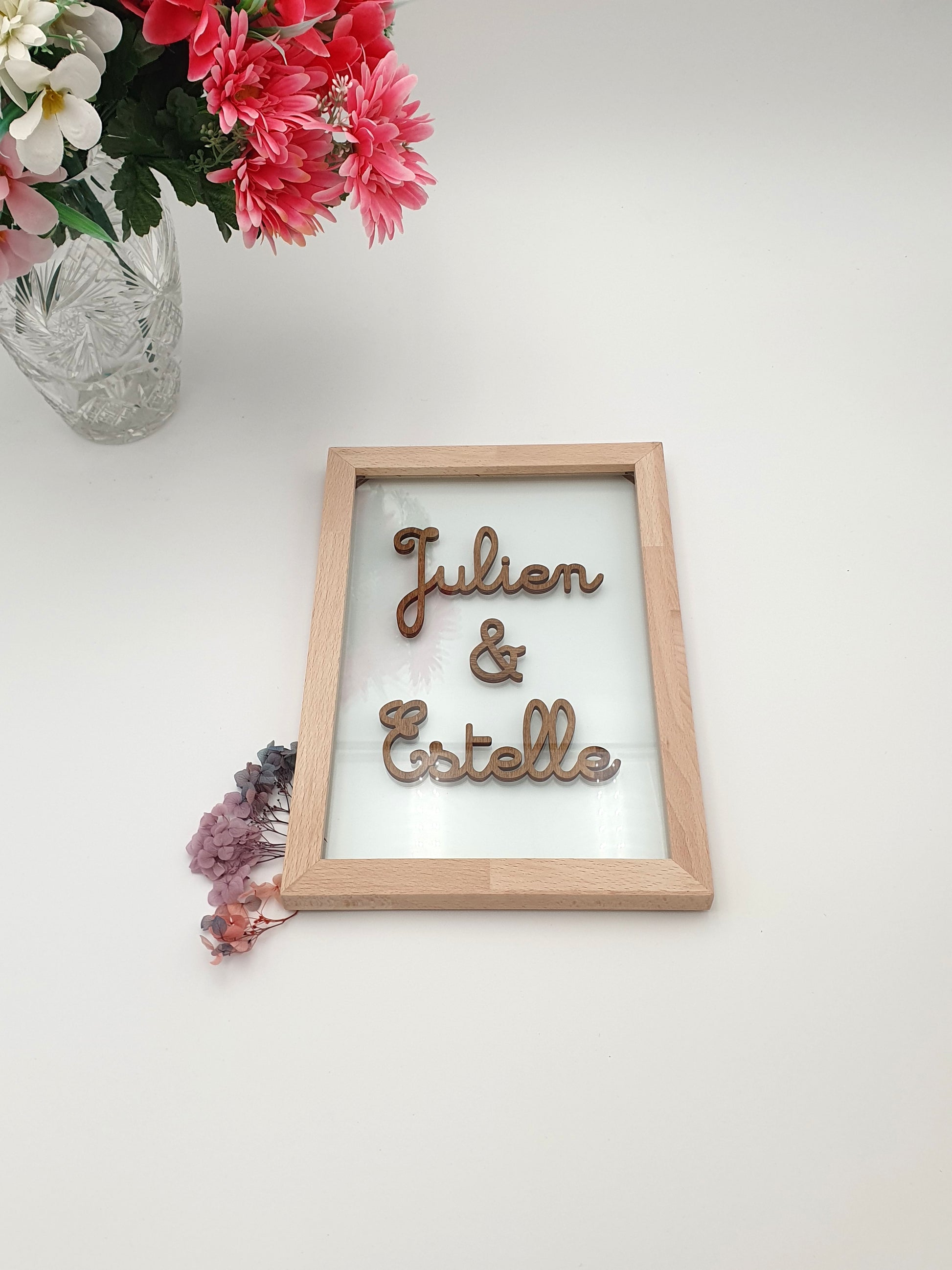 Grâce à l’effet “flottant” des lettres en bois, chaque prénom semble suspendu dans le cadre, créant une décoration à la fois moderne, élégante et pleine de tendresse.