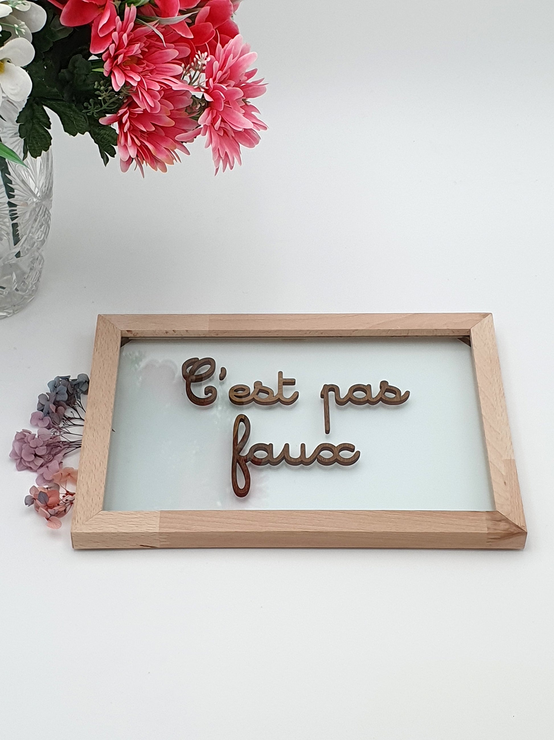 La célèbre réplique “C’est pas faux”, devenue légendaire, semble flotter à l’intérieur du cadre grâce à un texte découpé en bois et posé sur la transparence du verre.