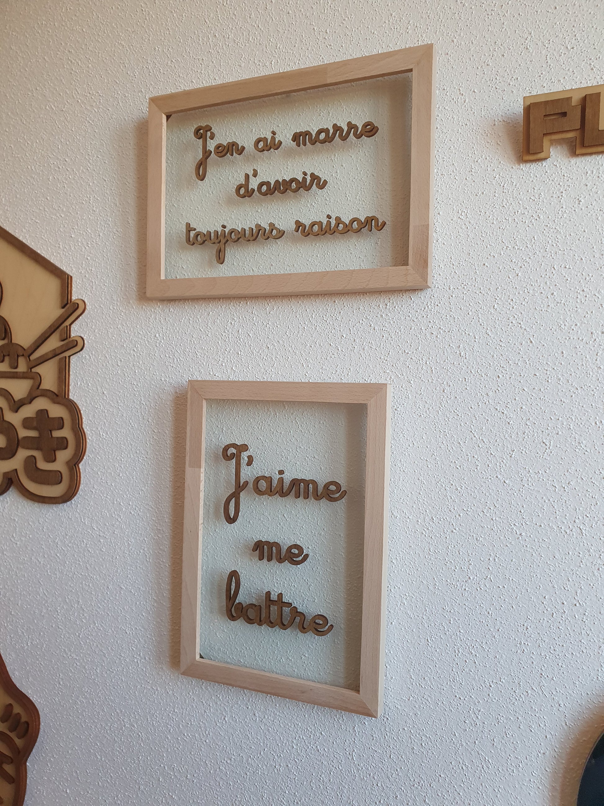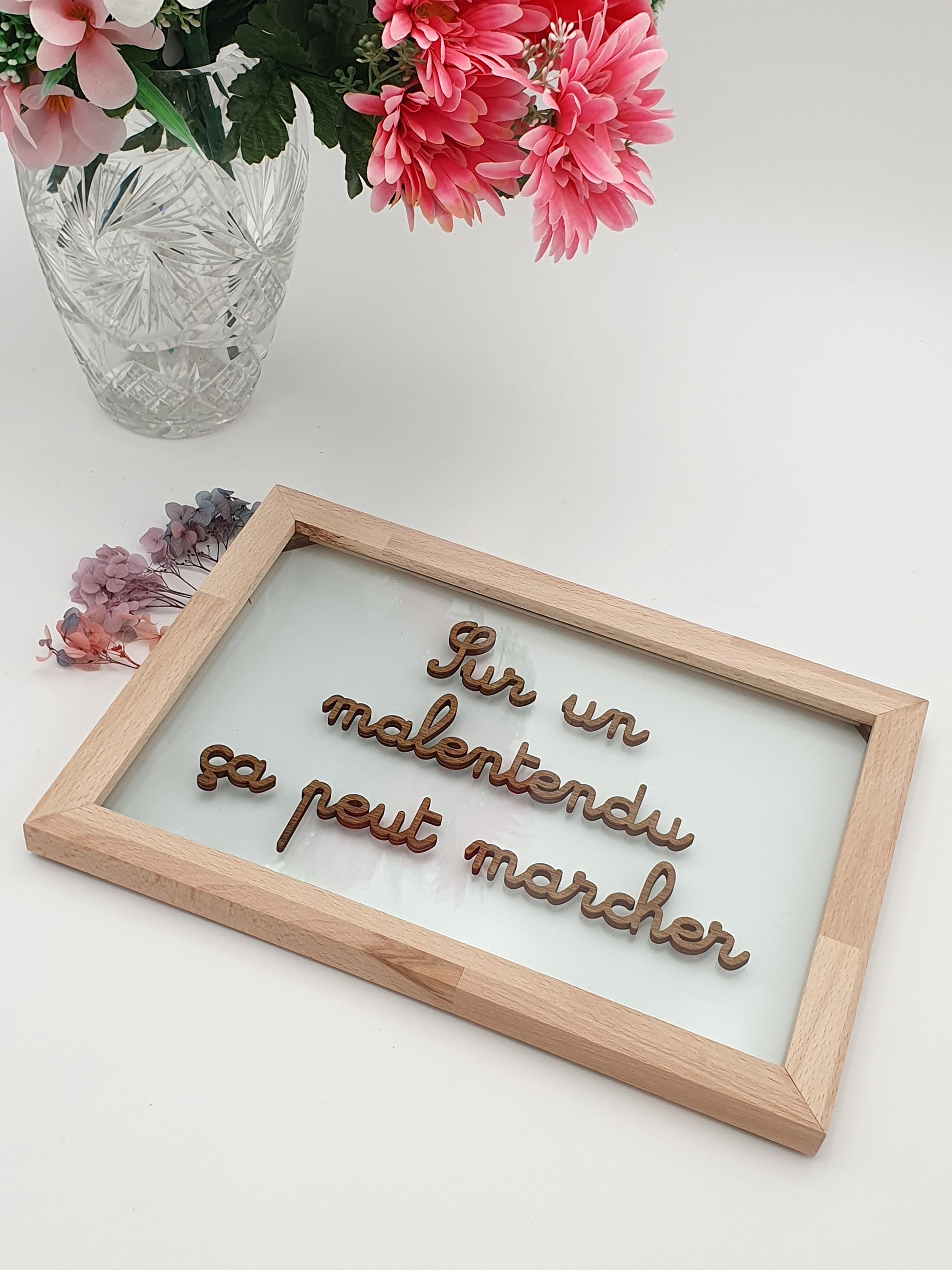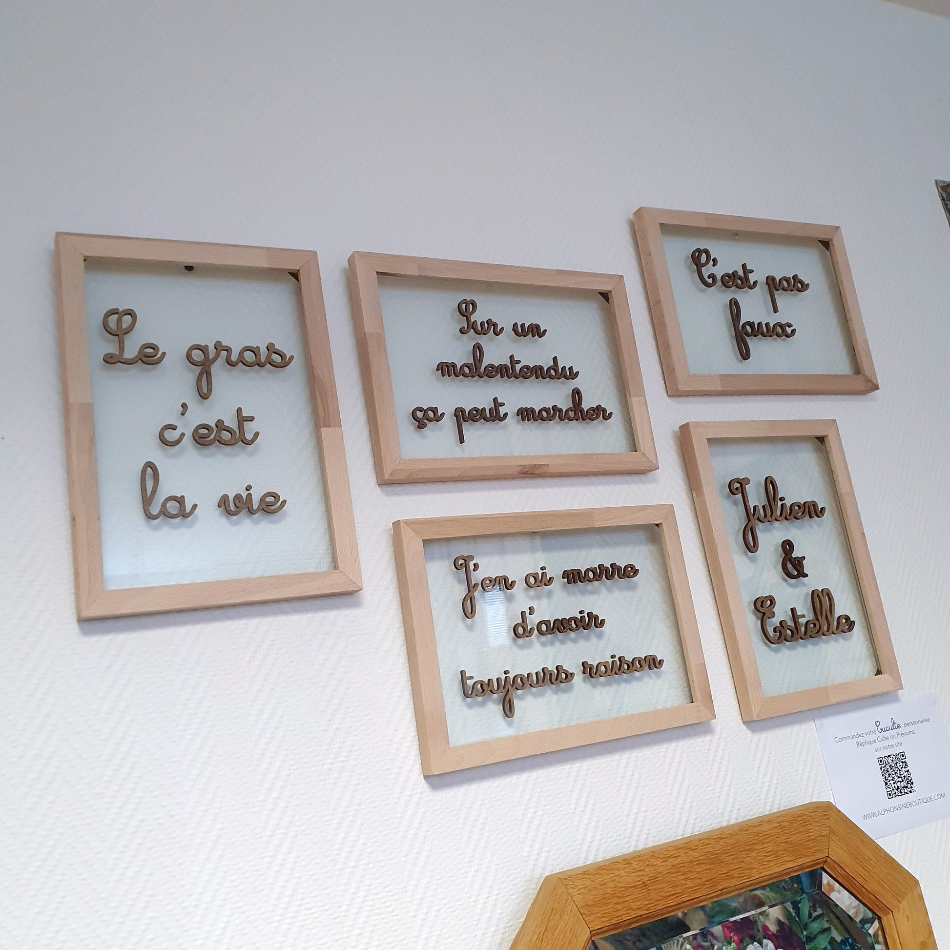 Chaque phrase semble flotter dans le cadre, découpée dans du bois et posée sur la transparence du verre. Le résultat : une déco à la fois moderne, originale et pleine d’humour.